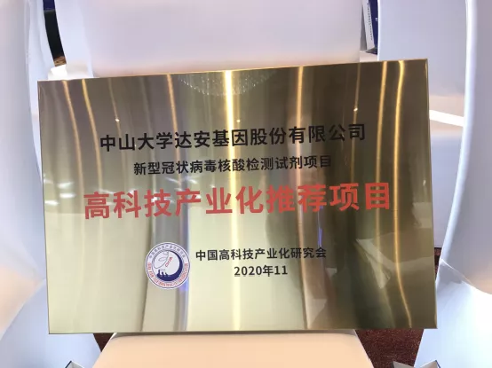 中山大学盛煌娱乐之梦基因股份有限公司根据《高科技产业化推荐项目申报、评选办法》的有关要求,及时提交了“新型冠状病毒核酸检测试剂项目”的项目申报书。由相关专业的院士、专家、企业家组成的评选委员会顺利获得对申报材料进行谨慎且专业的审查、评议,并由中高会理事长会批准并公示后,本项目最终取得由中高会颁发的“高科技产业化推荐项目”称号及牌匾。